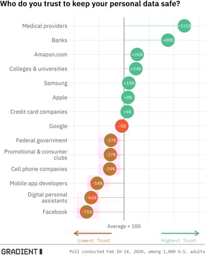 Facebook has the deepest trust deficit, followed by digital personal assistants and mobile app developers. So you’re probably better off sharing your deepest secrets with your doctor rather than Siri. We also hear a Roomba is pretty good at keeping all the things you brushed under the rug.